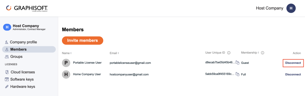 Ο Administrator ή Contract Manager της Host Company δεν μπορεί να διαχειριστεί τις άδειες των guest χρηστών.